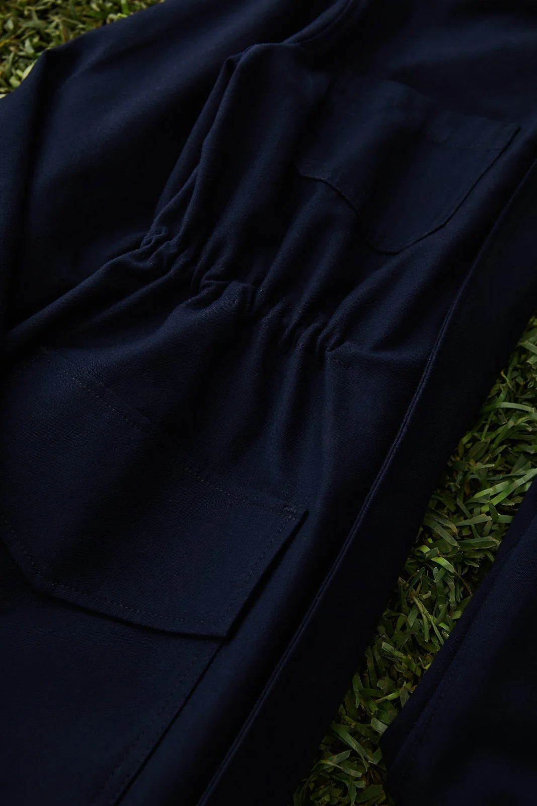 Introducing a relaxed fit utility jacket and pant in our 100% cotton sateen. The classic layering piece is relaxed in fit with patch pockets, storm flap, and interior drawcord at the waist